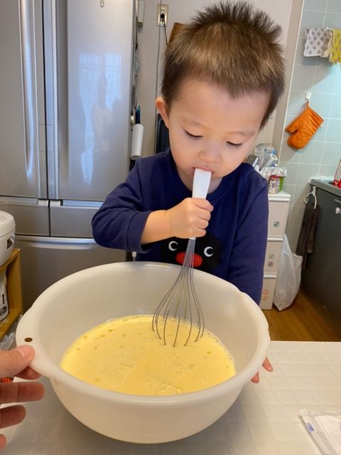 泡だて器で混ぜるのを手伝ってもらおうとすると、手ではなく何故か口で加えて混ぜようとします。